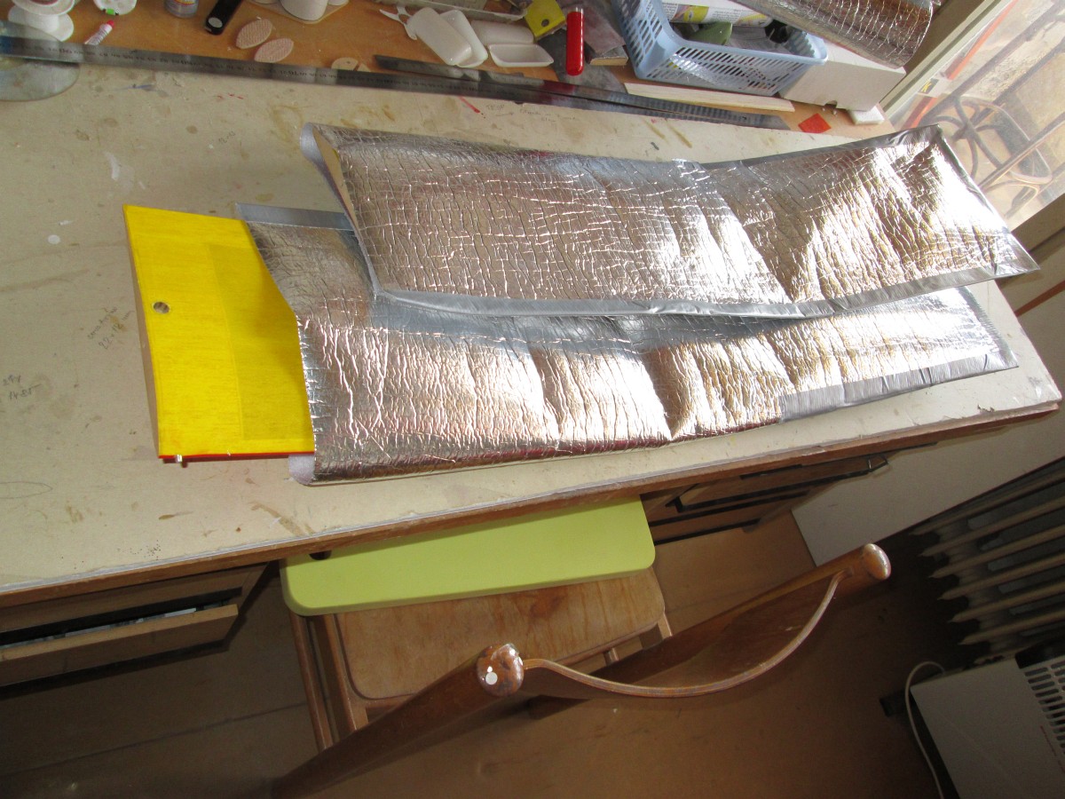 Pripravte si panely horného poťahu polovíc krídla z Depronu 4 mm a s presahom vpredu aj vzadu po 15 mm. Naohýbajte do oblúka, aby pasovali na rebrá. Na obrázku je krídlo, zozadu zužujúce sa ku koncom o 15 mm. Celkom to zrýchlilo model 😉 Počas skúšania tvaru a nanášania purexu na rebrá, nosník a nábežnú a odtokovú časť spodného poťahu si môžete pomôcť nízkym závažím, podmienkou je, aby ste ho nezabudli odstrániť pred definitívnym položením horného poťahu, ako sa to stalo mne pri stavbe dvadsiateho krídla 😀