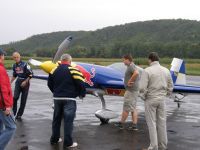 Dnes krátko po pol jednej na našom domovskom letisku v Sklabinej pristálo letecké akrobatické eso Péter Besenyei z Maďarska, ktorý sa tu zastavil pred svojím vystúpením na Feste v Plášťovciach. Na Feste sme mali mať dnes, v sobotu popoludní, svoje niekoľkohodinové vystúpenie aj my s našimi modelmi, ďaždivé počasie nám však urobilo škrt cez rozpočet. Tak sme aspoň vyšli v ústrety organizátorom akcie a pred príchodom oficiálnej delegácie a zástupcu Leteckého úradu zabezpečili letisko pred nepovolanými osobami, ktorých sa tu dosť často potuluje neuveriteľné množstvo a svojou prítomnosťou ohrozujú bezpečnosť na ploche, a skontrolovali pristávaciu plochu na výskyt kaluží vody alebo odpadkov po menovaných nespratníkoch. Keďže všetko bolo OK, vyčkali sme na prílet pána pilota, všetko filmovali alebo fotografovali. Potom sme sa samozrejme išli pozrieť aj na jeho vystúpenie do Plášťoviec.